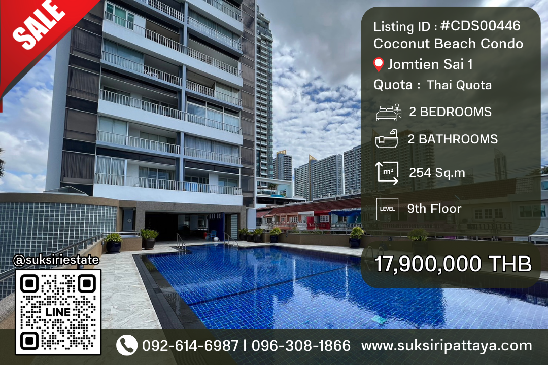 Coconut Beach Condo for sale, 17-story building, size 254 sqm., 2 Bedrooms, 2 Bathrooms, 9th floor, sea view, full furnished andย electrical appliance, Price 17.9 MB!