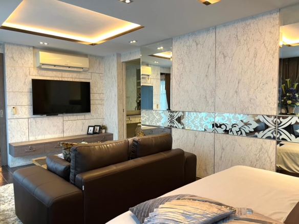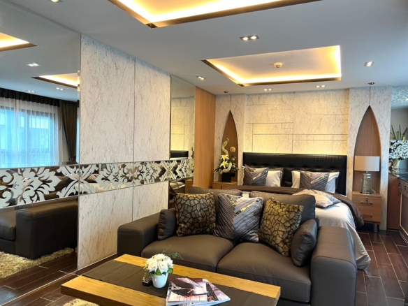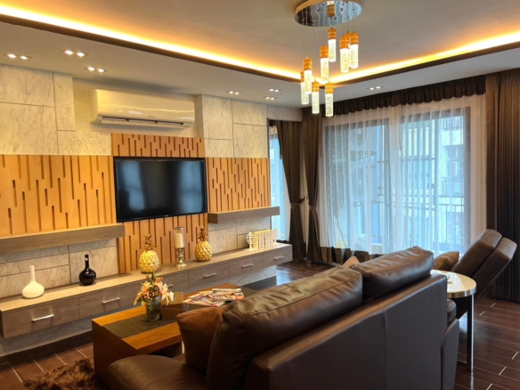 คอนโดพร้อมสิ่งอำนวยความสะดวก เช่น สระว่ายน้ำ ฟิตเนส และสวนเพื่อการพักผ่อน