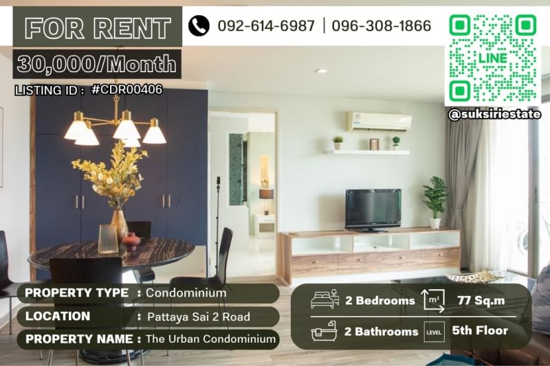 The Urban Condominium For Rent, Size 77 Sqm., 2 Bedrooms, 2 Bathrooms, 5th floor, City view, Full Furnished and electrical appliance Rental price 30K/Month! ๐๐‘๐Ž๐๐„๐‘๐“๐˜ ๐ƒ๐„๐“๐€๐ˆ๐‹๐’ : The Urban Pattaya 2 Bedrooms 2 Bathrooms Area approximately 77 Sqm Located on 5th floor City view Fully Furnished and electrical appliance ๐‘๐„๐๐“ : 30,000 THB per month ๐ƒ๐„๐๐Ž๐’๐ˆ๐“ : 2 months ๐‹๐„๐€๐’๐„ : 1 Year Contact me for viewing: ๐Ÿ“ž + 66 92 614 6987 ๐Ÿ“ž +