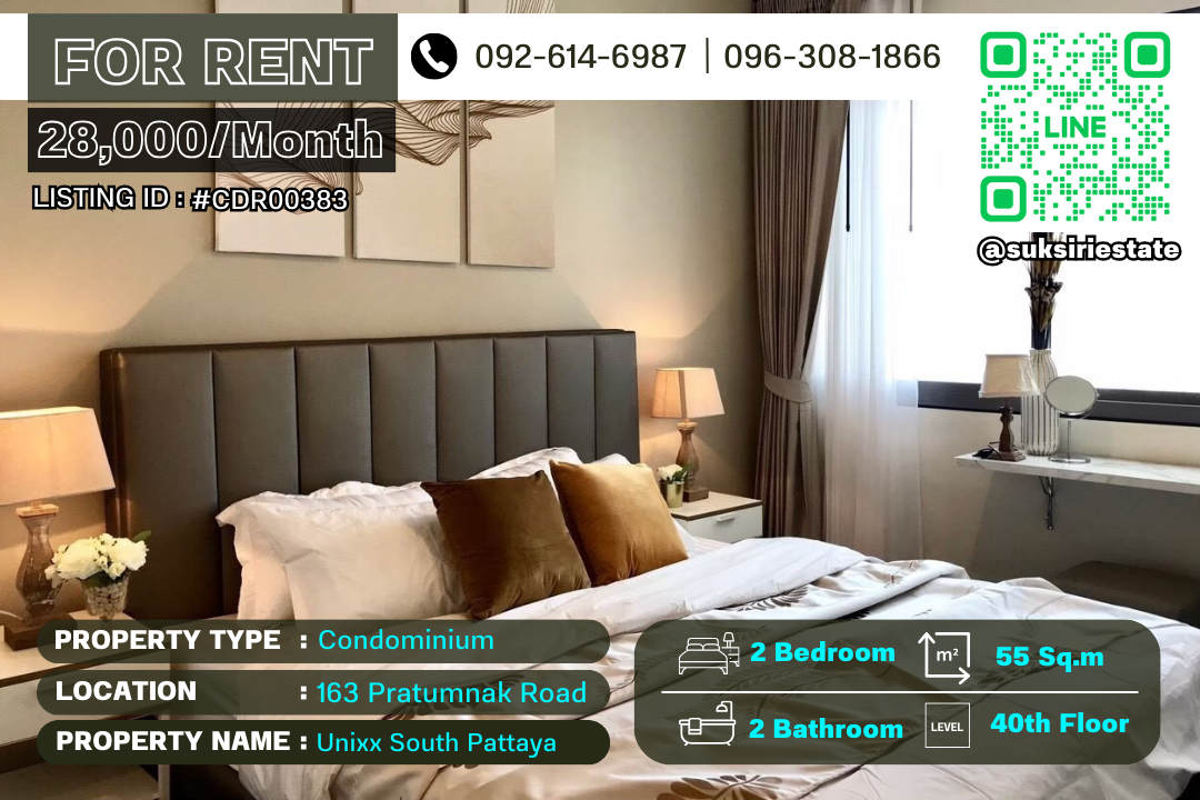Unixx South Pattaya for rent at high floor 2 Bedroom 2 Bathroom, ready to move in on 40th floor, fully furnished, only 28,000 THB/Month. ๐๐๐๐๐๐๐๐ ๐๐๐๐๐๐๐ : Unixx South Pattaya 2 Bedrooms 2 Bathrooms Area approximately 55 Sqm Located on 40th floor Sea view, Fully Furniture Facilities elevator, parking, 24-hours security, cctv, swimming pool, gym. ๐๐๐๐ : 28,000 THB per month ๐๐๐๐๐๐๐ : 2 months ๐๐๐๐๐ : 1 Year Contact me for viewing: ๐ +