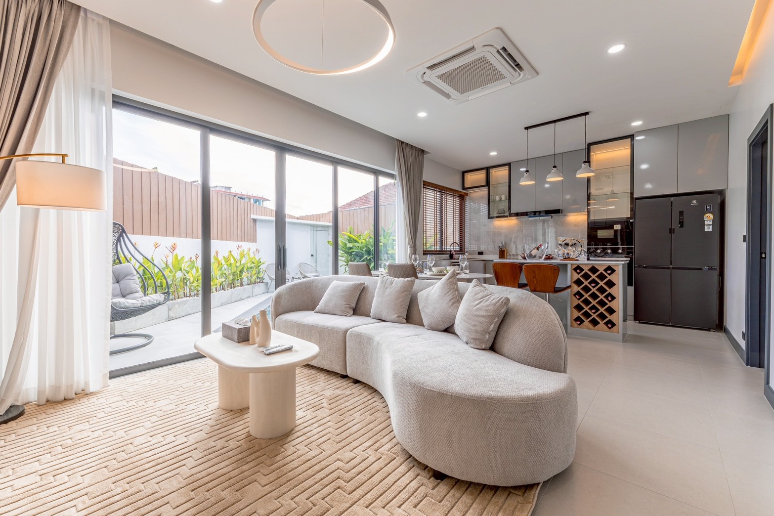 ห้องครัวแบบ โอเพ่น kitchenพร้อมเคาน์เตอร์ มีช่องเก็บไวน์